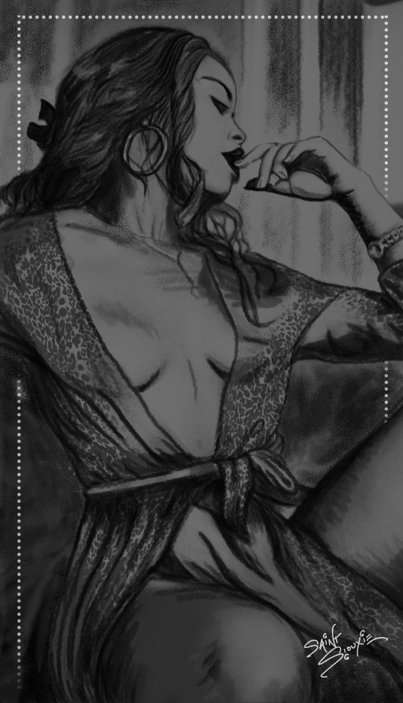 A lot of times, I take creative liberties with features and background, but I love my model’s photo and background, so I tried to keep true to the original. There is one element from the photo that I incorporated into my painting – the cheetah pattern on the robe. When previewing between my painting and the photo underneath, the pattern on the robe was something that really added an extra depth that I wanted to keep, so I kept it as a layer under the original drawing.